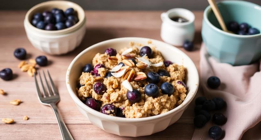 This baked oatmeal is naturally sweetened with ripe bananas and dates, then studded with juicy blueberries and crunchy walnuts for texture. Coconut adds a subtle tropical note, making this dish both comforting and flavorful. It’s a filling, nutrient-dense option that works well for meal prep or serving at a relaxed weekend brunch.