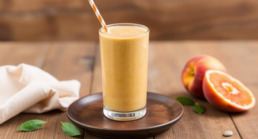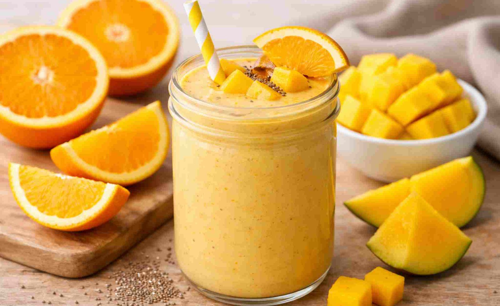 Ripe oranges and frozen peaches come together with thick, creamy Greek-style yogurt to create a smooth and refreshing breakfast drink. Naturally sweet Medjool dates provide just the right amount of sweetness without any added sugar. Chia seeds enhance the smoothie with plant-based protein, fiber, and heart-healthy omega-3 fats, while a hint of vanilla adds a soft, comforting finish to the flavor.