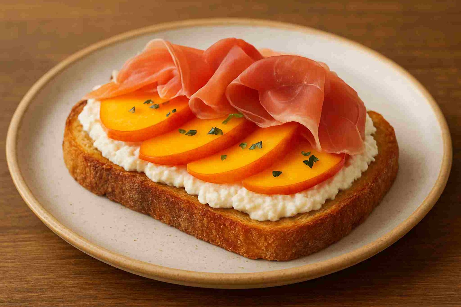 This ricotta toast combines creamy cheese, juicy peaches, and savory prosciutto for a perfectly balanced bite. Ideal for breakfast or brunch, it’s finished with fresh herbs like basil or mint to enhance both flavor and freshness.